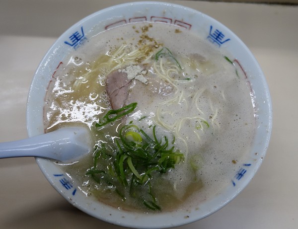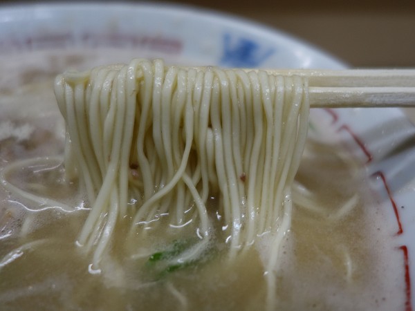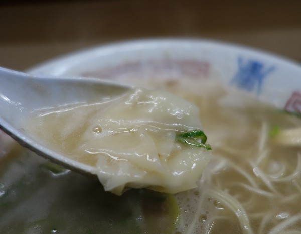 麺は硬さ指定なしで、一見福岡標準の極細麺かとよく見てみたら平打ち麺。硬さ指定なしでも芯が残るサクサク食感で口の中で躍る。ワンタンは福岡標準の小振りで皮薄めのチュルチュル食感、餡は少量ながら強めでクセのある味で6個ほど。