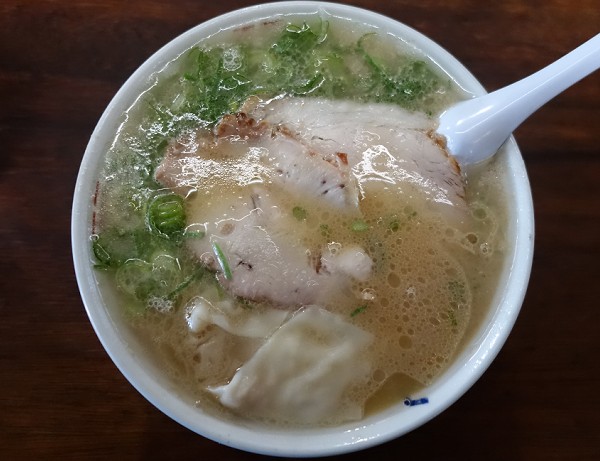 ワンタンはやはり博多標準の薄皮で餡の味強めクセありが6個ほどでチュルチュルと口の中でとろけてウマー。