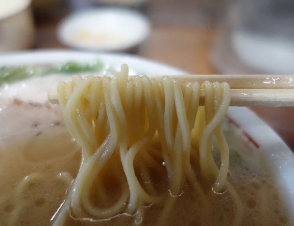 麺は硬さ普通で#22くらいの中細麺で麺線短め表面ざらつきある丸麺で、黄色み帯びており香りよく麺自体の味が濃く、豚骨スープとの相乗効果でさらに旨くなる。カタコールしなくて良かったタイプ。
