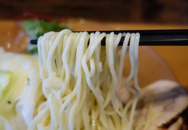 麺は中細でわずかに波打ちコリコリ食感で「原田製麺」とは異なる趣き。物凄く細かく刻まれた青葱が個性的で絶妙。