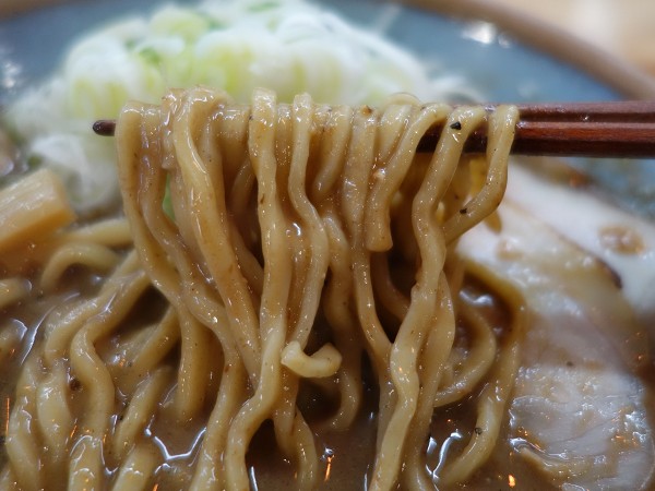 ある意味、関東の濃厚魚介つけ麺のつけ汁に麺をぶっこんだラーメンな感覚もあり。麺はややワシワシ感ある逆切り中太平麺で、連食中には破壊力の強い麺ながら満足感は高い。