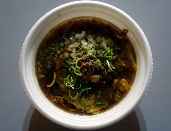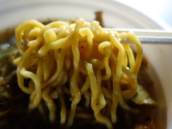 「Neo背油醤油ラーメン」。熟成濃い口で酸味のあるカエシに、出汁感は不明。実店舗では「浅草開化楼」製の麺使用らしいが、今回のは不明ながらそこそこ食べ応えのある中太縮れ麺。焦げた油脂が町中華のような風味。