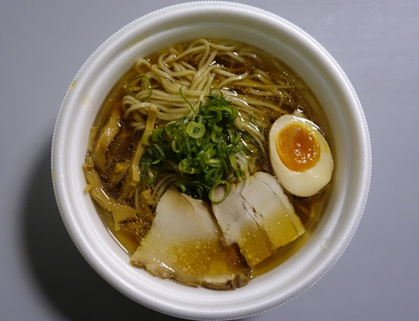「地鶏とはまぐりの醤油そば」。想像以上に淡麗な清湯鶏醤油ベースに貝の旨みたっぷりのスープに、蕎麦を彷彿とさせる全粒粉入りの中細麺が旨い。過去のひろしまラーメンスタジアムでは、作業環境の劣悪さからか、質の良くないものが多かったが、今回は非常に質の高いものが多かった印象。