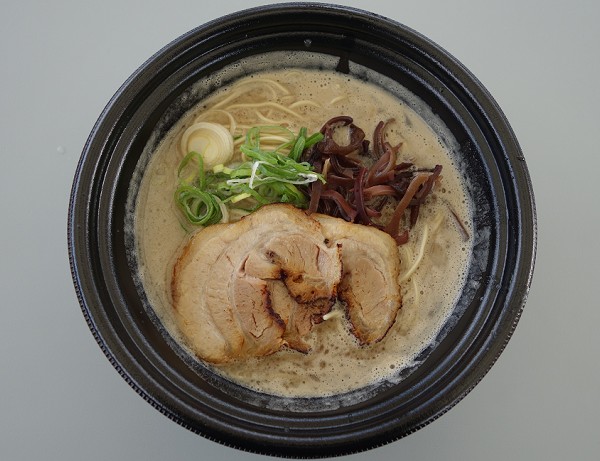 「濃厚博多豚骨炙りチャーシューメン」。今時風に泡立ちながらも、作為的ではない泡。福岡標準では濃いめな部類の濃厚豚骨ながら臭みやクセがなし。