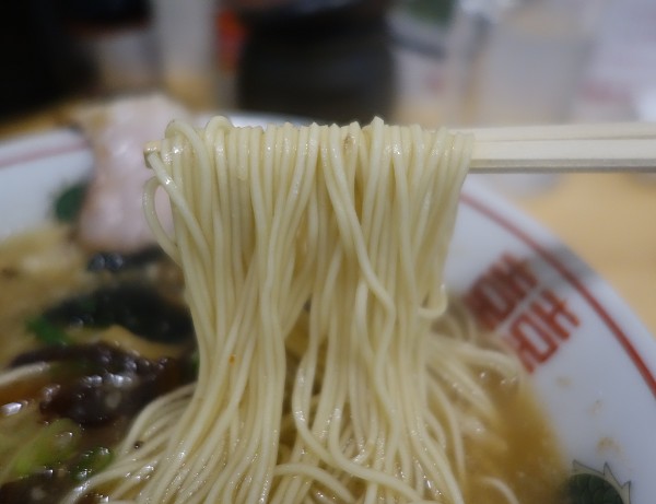 微乳化の豚骨ベースはカエシ優位で背脂浮き、葱香油が効いている。細メンマには唐辛子がまぶされていて芸が細かい?