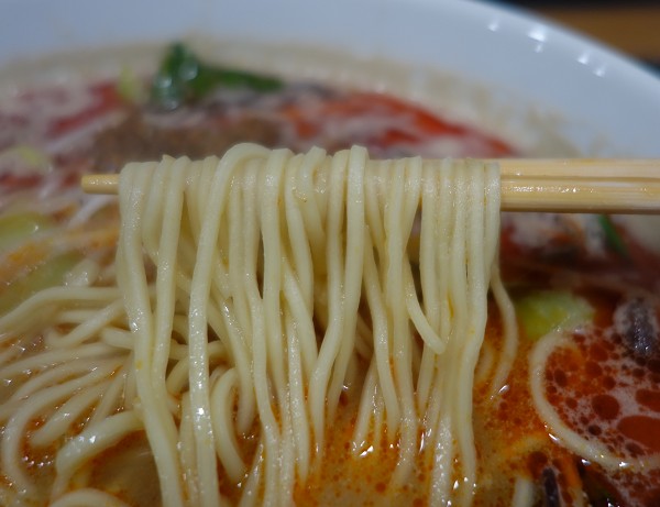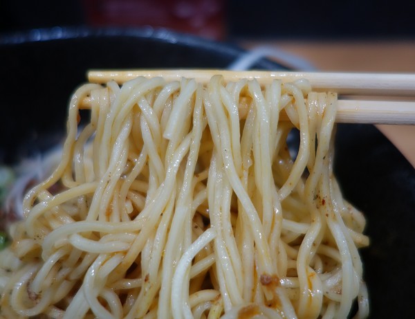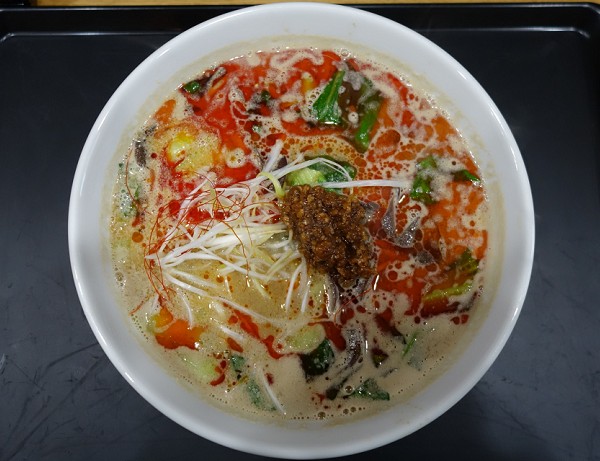 まずは「担々麺」。スープはさらっとしながら出汁感豊かで個性的な汁あり担々麺。麺も三次の製麺所製のもっちりとした#22くらいのストレート麺も何気に特徴的。