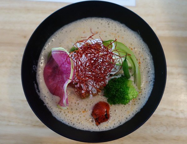 「薬膳担々麺」。豆乳と胡麻を泡立てたきめ細かいスープは濃厚ながら軽やか。